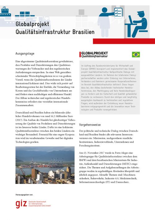 Within the framework of the Global Project Quality Infrastructure, Brazil and Germany have been engaging in a technical and political dialogue on quality infrastructure since 2017, with the aim to reduce technical barriers to trade and to improve consumer protection. The political partner of the Federal Ministry for Economic Affairs and Energy in Brazil is the Ministry of Industry, Foreign Trade and Services (MDIC). Standardisation, conformity assessment, accreditation and market surveillance are the key topics of the dialogue.